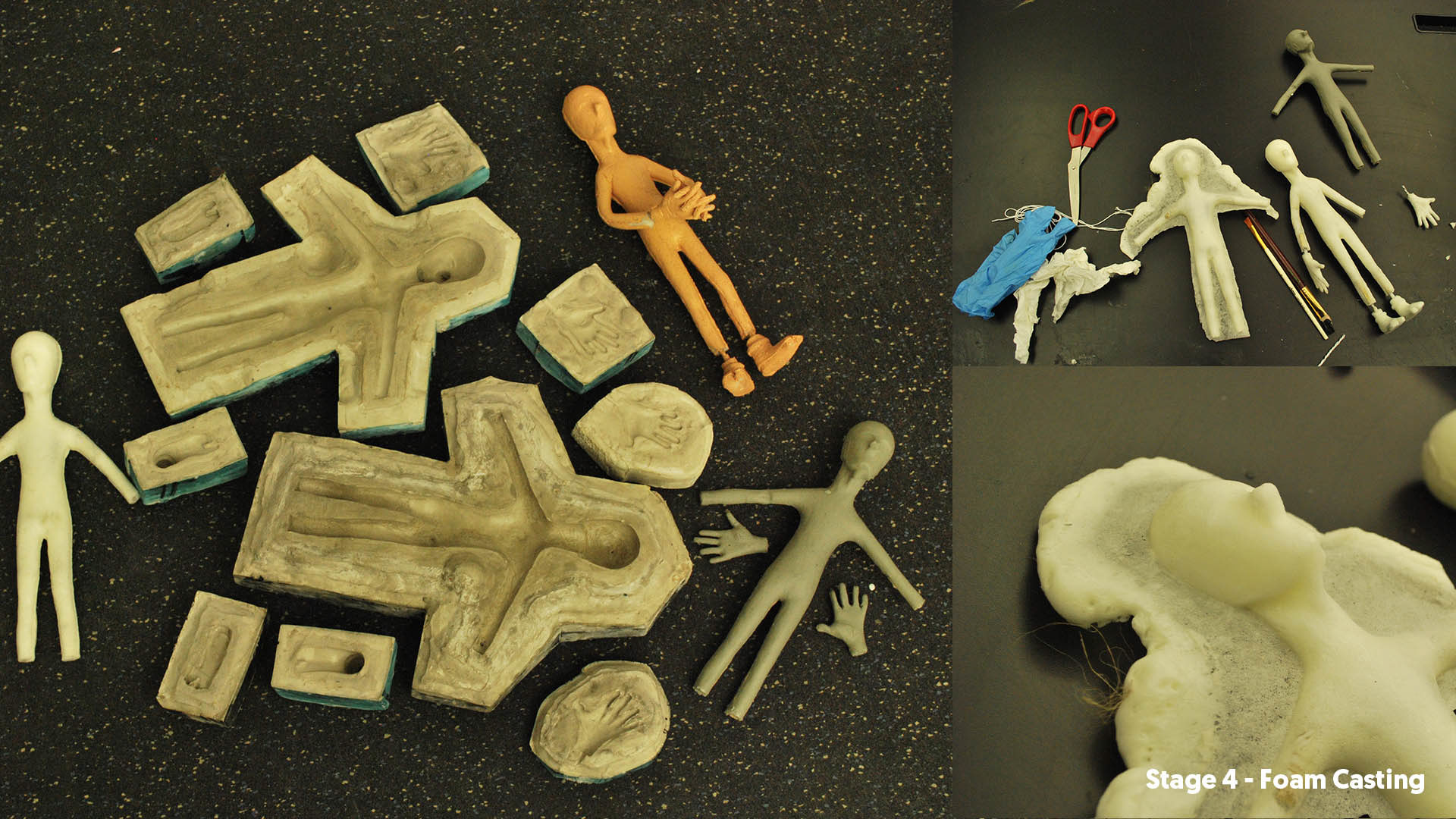 Stage 5. After few hours, open up the plaster cast and remove foam body, cleaning and coloring with acrelic paints.